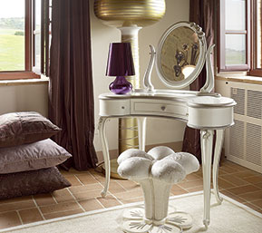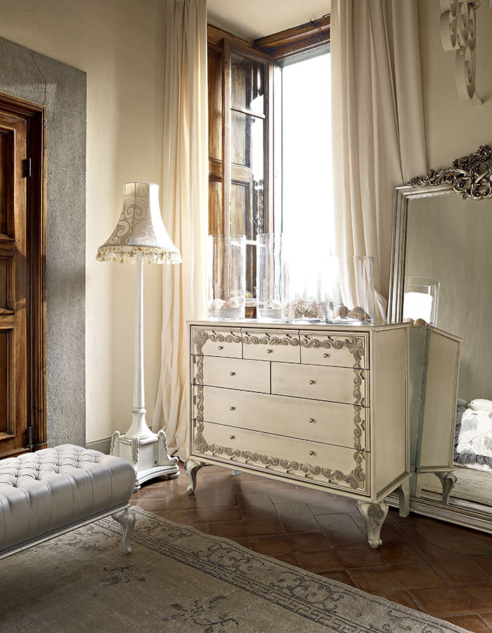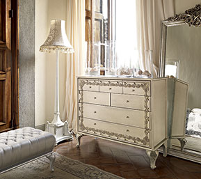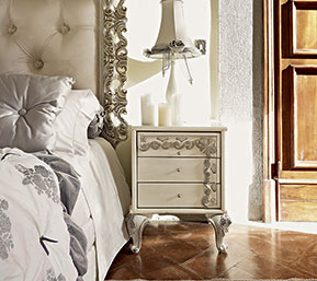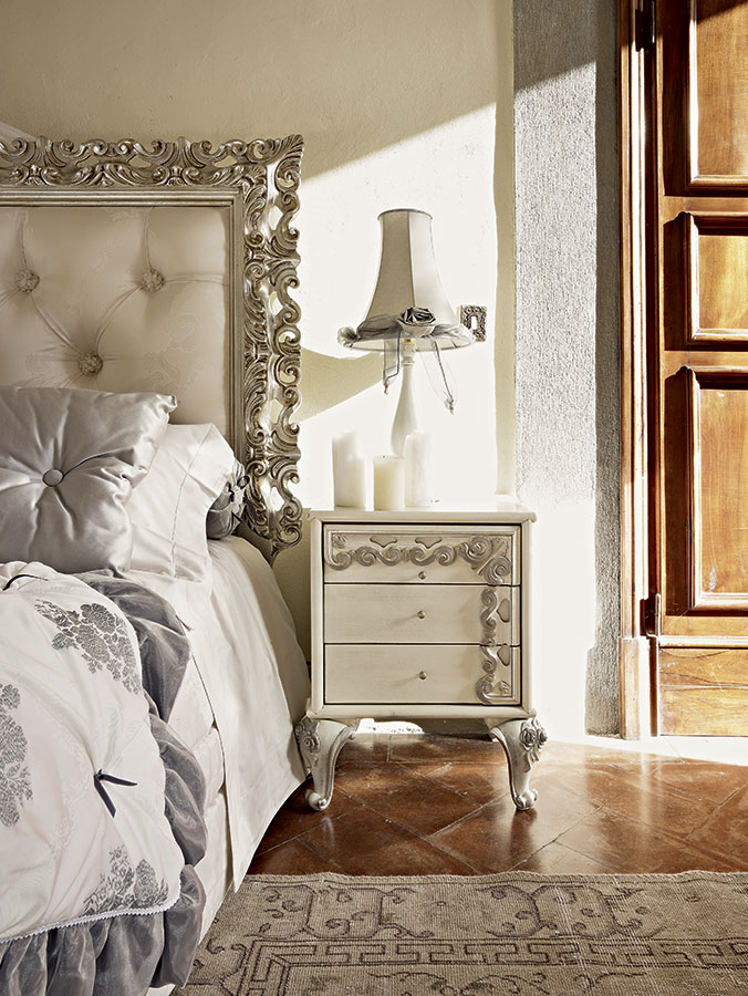 Solid materials are the throbbing heart of this furniture with handcrafted style and new decorations providing key sources of inspiration. The ANGELICA headboard with capitonné finish has a precious silver-carved frame. The same pattern is reproduced on each of the drawers of the tallboy and bedside tables.