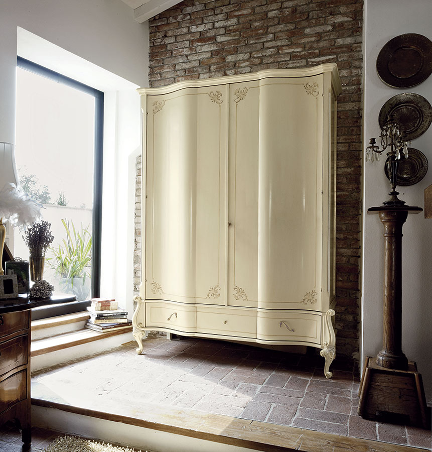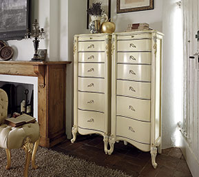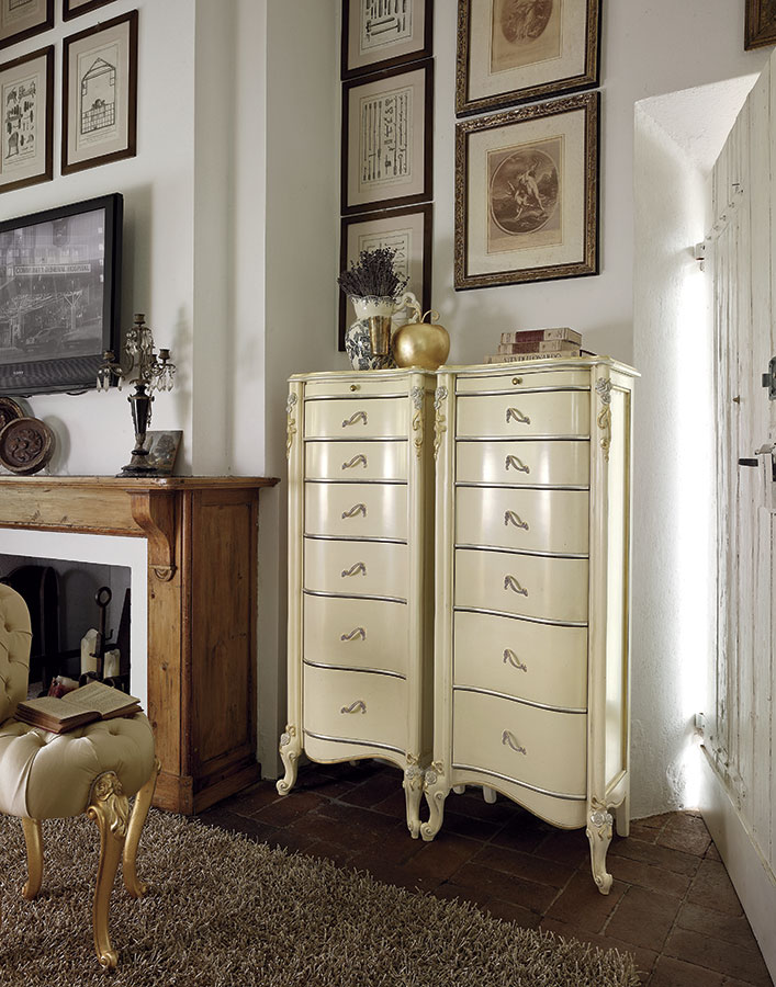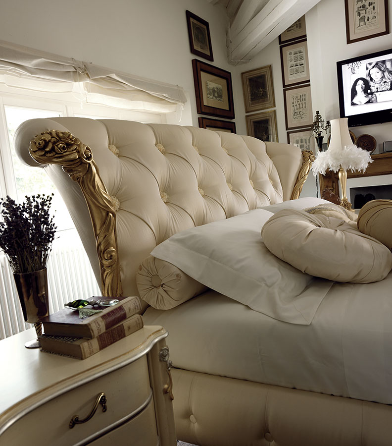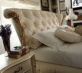 Riscoprire il valore del lavoro manuale e le pregiate tecniche di lavorazione artigianale del legno. Una zona notte preziosa, seducente fatta dettagli in oro morbide imbottiture capitonné. Il letto è presentato con i lenzuli Livia, piumone Alda e scaldato CAPRI. Settimini e comodini CAPRI laccati bianco polvere con particolari in oro e argento.