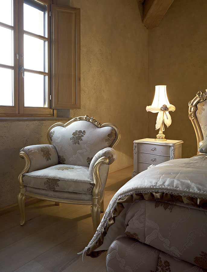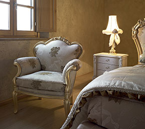 This DILETTA bed has carved legs which, together with the padded bed surround, are signs of timeless elegance, where quality and details stand out. The cream-lacquered CAPRI tallboy and bedside tables are ideal complements to the whitened gold finish of the bed. The duvet of the Brigantino series is matched to the CAPRI warmer.