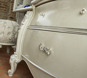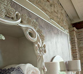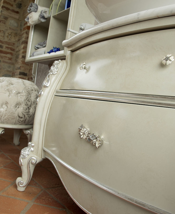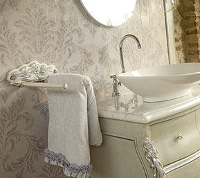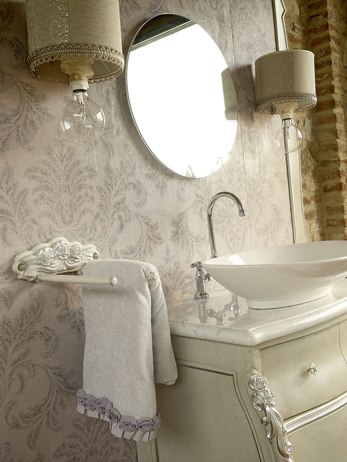 Carving wood, consummately crafted, give a regal look to this sumptuous bathroom from Volpi. This solution has a boiserie panel, where the accessories of your choice can be fitted. The suggested combination of wall lights and jewel-like handles provides a further touch of elegance. The fabric of the CAPRI capitonné pouf matching the printed boiserie panel may not go unnoticed.