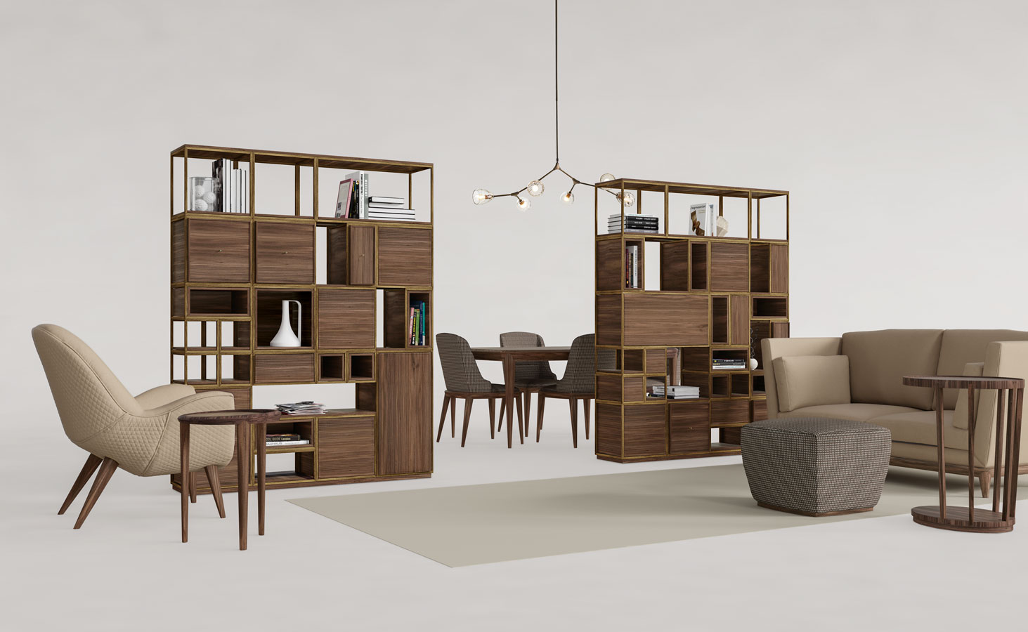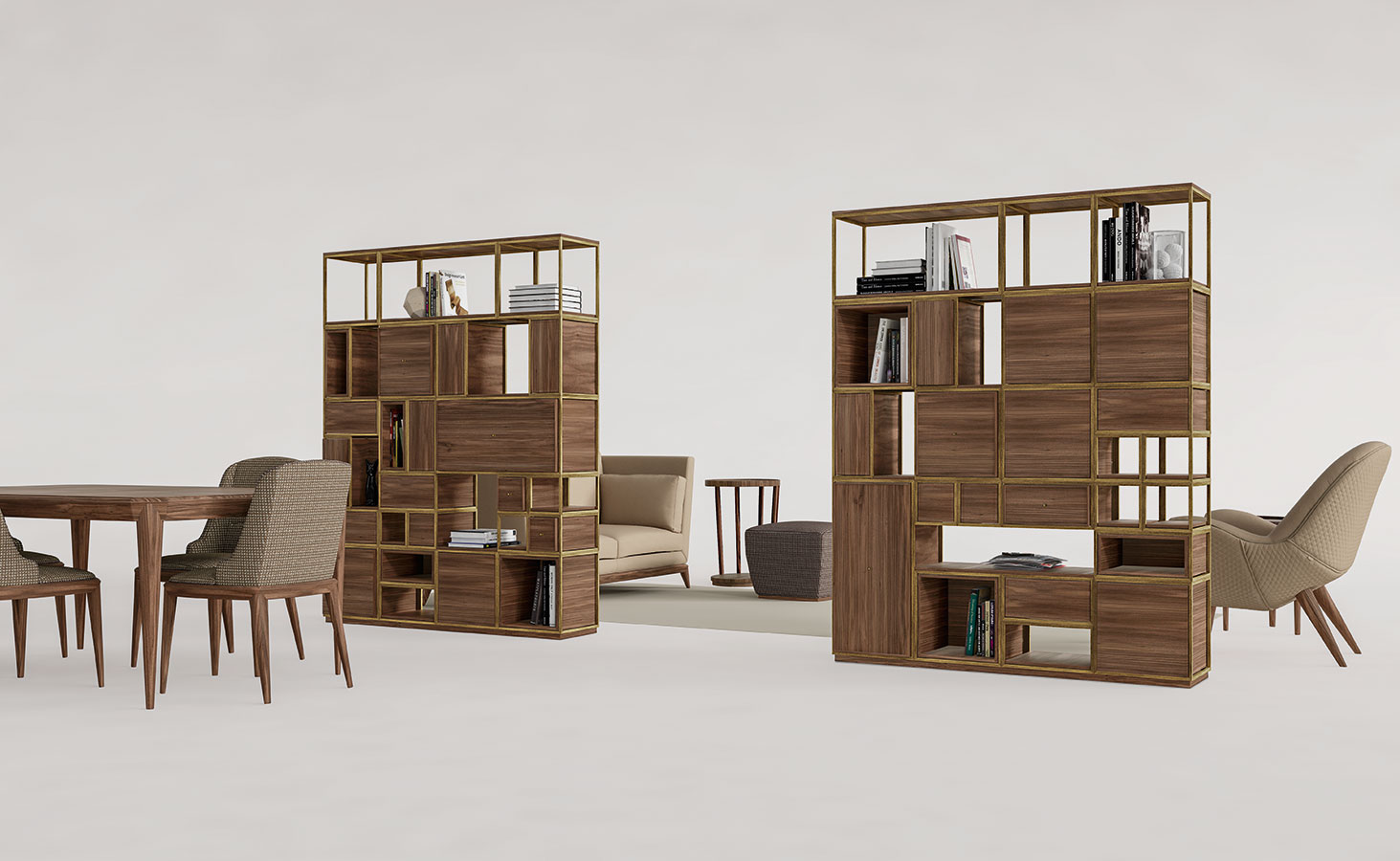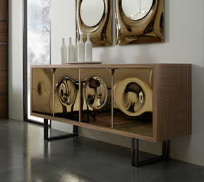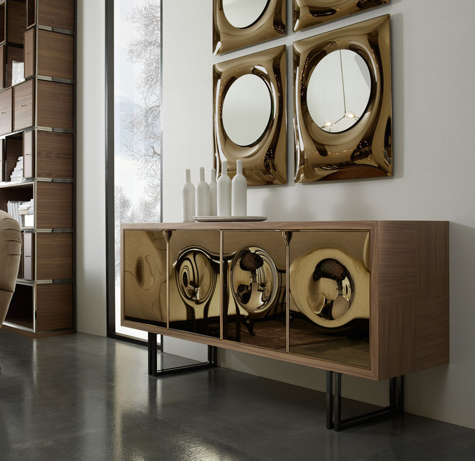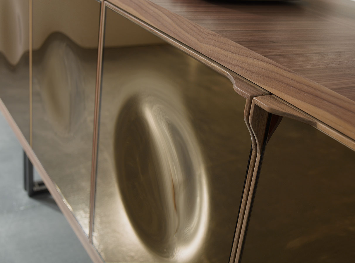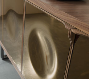 Il cristallo come immagine di eleganza contemporanea. Il cristallo bronzato, curvato a granfuoco e argentato a specchio reinterpreta la lavorazione artigianale in soluzioni contemporanee.
